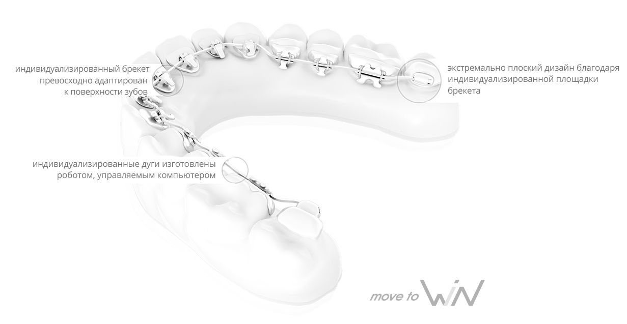 Этот вид брекетов сложнее в изготовлении, они создаются индивидуально для каждого пациента. Это решение стало развитием двух технологий, цифровой технологии расчета движения зубов и дуг с запрограммированным усилием. Вместе они позволяют создавать брекеты, повторяющие форму тыльной стороны зуба и дуги, которая, соединившись с ним, передает на него дозированное усилие в нужном направлении.